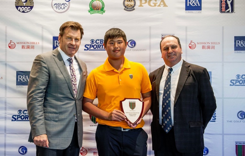 Photo caption: Tsai Kai-jen receiving his prize from Sir Nick Faldo and Mission Hills’ Iain Roberts at last month’s Grand Final.