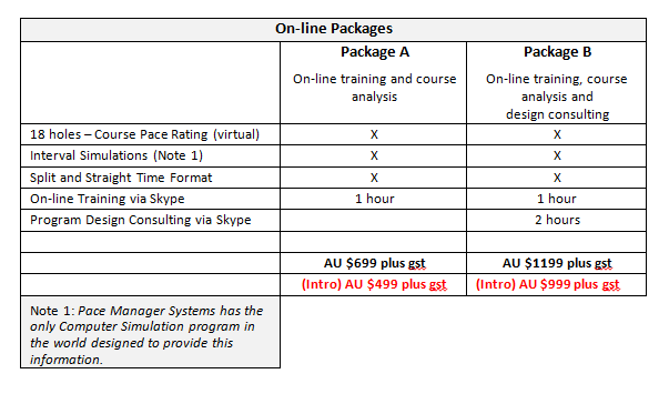 The on-line service packages, including virtual course pace rating and face-to-face coaching via Skype, aim to leave you and your team with the ability to diagnose the probable causes of slow play on your course, and with the custom-designed tools to measure and monitor an improved pace and flow of play for your playing guests.