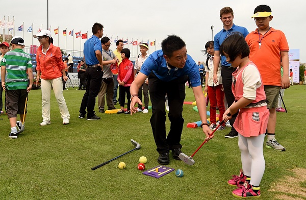 After an impromptu crash course in Mandarin – staged much to the delight of the cheering kids – the players set down to the task of teaching, showing off their skills with a variety of clubs and then taking part in an accuracy competition.