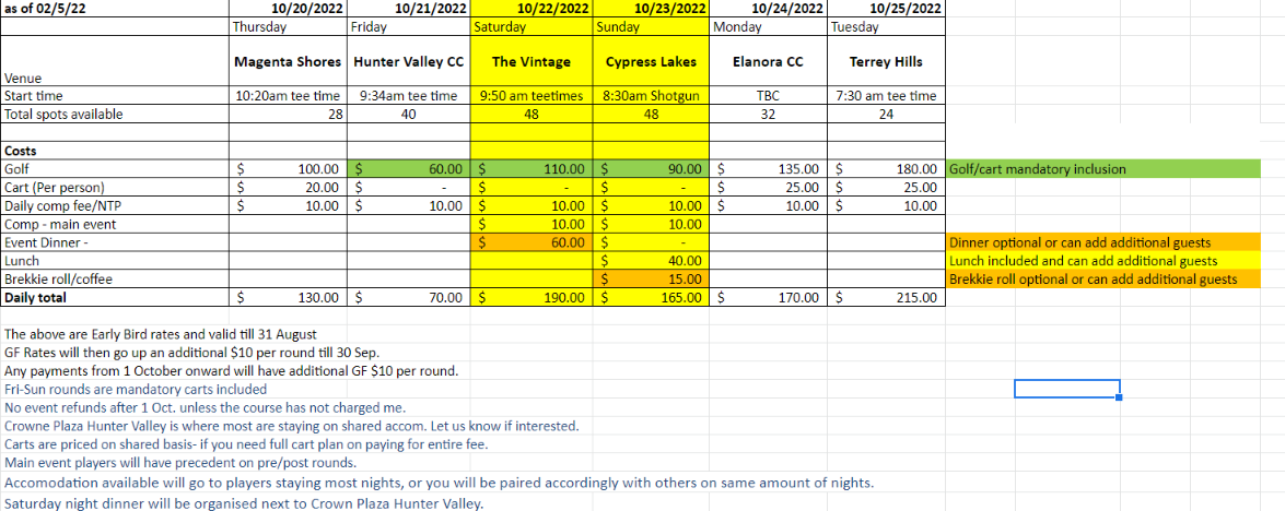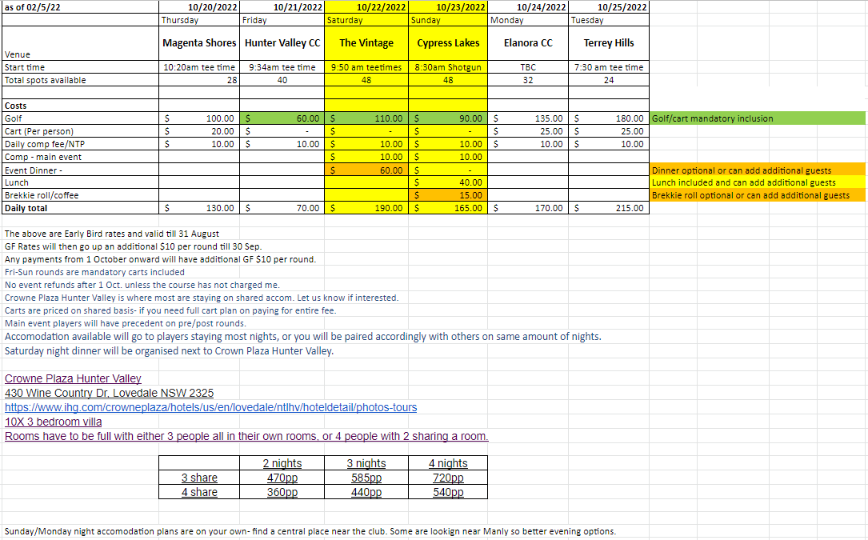Im finally getting a work break- and will start chasing people. I want to get the golf portion to start and then sort our Accom as we can pair people accordingly to room requests.